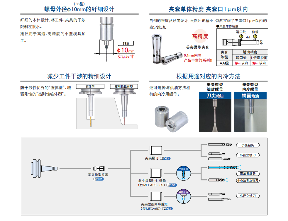 产品描述:小径钻头・小径立铣刀用美夹微型刀柄。 螺母外径为φ10mm的纤细设计, 将工件和夹具的干涉控制在很小限度,建议用于高速、高精度的小型模具加工。 ...